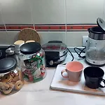 يتوفر المطبخ المجهز مع الغلاية الكهربائية والآنية الزجاجية كجزء من مرافق الخدمة الذاتية في مكان الإقامة.